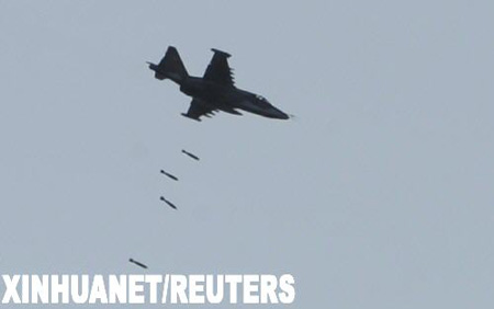 8月8日,一架戰(zhàn)斗機(jī)在格魯吉亞南奧塞梯首府茨欣瓦利附近投擲炸彈。新華社/路透