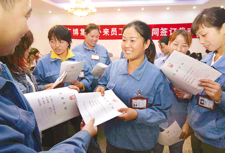 浙江廣博集團(tuán)有限公司外來員工在簽訂勞動(dòng)合同時(shí),高興得合不攏嘴——企業(yè)已把外來員工免費(fèi)享受五大保險(xiǎn)的內(nèi)容寫進(jìn)了合同。(胡建華 攝)