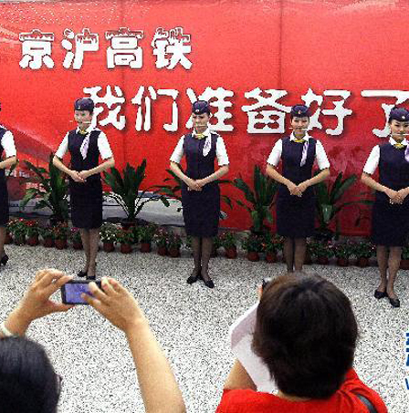 6月15日,高鐵乘務(wù)員進(jìn)行車廂內(nèi)禮儀培訓(xùn)。為迎接即將開通的京滬高鐵,京滬高鐵上?瓦\(yùn)段乘務(wù)員正抓緊最后的上崗前培訓(xùn)。目前,一支由90名列車長(zhǎng)、313名乘務(wù)員組成的京滬高鐵上?瓦\(yùn)段乘務(wù)員隊(duì)伍已整裝待發(fā),準(zhǔn)備迎接社會(huì)各界的檢閱。