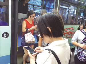 坐公交車不用再“傻等”“盲目等”。昨日,市民朱小姐在出門前先用手機(jī)查看公交車還有多長時間到站,然后掐著時間點(diǎn)到站乘車。