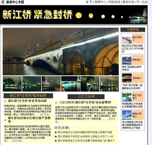 中國寧波網(wǎng)第一時間在首頁醒目位置發(fā)布最新消息,同時及時為廣大網(wǎng)民提供交通資訊。網(wǎng)站在論壇、博客、評論等互動性欄目,開通新江橋緊急封橋互動交流平臺。寧波網(wǎng)主動收集及疏導民意,使網(wǎng)民對新江橋緊急封橋事件有正確的態(tài)度。寧波網(wǎng)還在網(wǎng)上開展系列調查,多數(shù)網(wǎng)民贊成先建便橋,最后市政府吸取民意修建便橋。網(wǎng)站還讓網(wǎng)民積極參與新江橋重建方案的討論,網(wǎng)民建議新江橋重建時在新江橋上建觀光塔,這一建議已被寧波市政府采納。