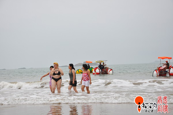 假日,朱家尖的海灘上游人如梭,老外的身影也進入了鏡頭,看她們游興正濃,表露出對這片海灘的愛戀!